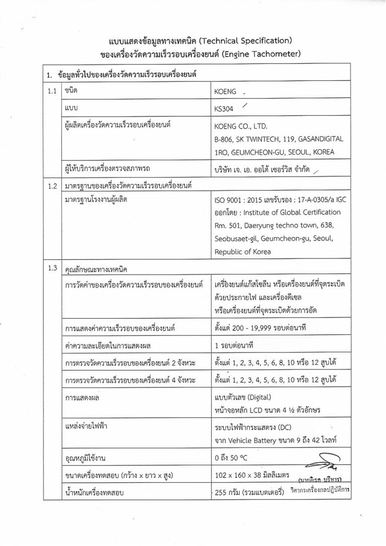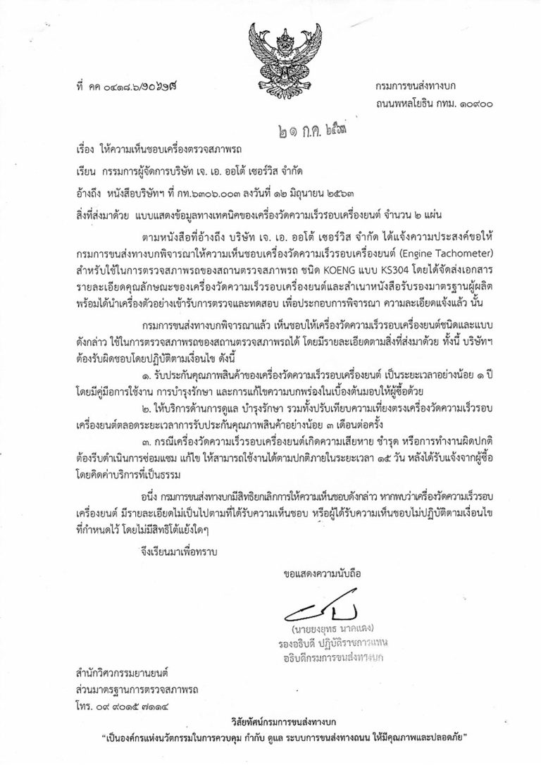 ตามหนังสือที่อ้างถึง บริษัท เจ.เอ. ออโต้ เซอร์วิส จำกัด ได้แจ้งความประสงค์ขอให้กรมการขนส่งทางบกพิจารณาให้ความเห็นชอบเครื่องวิเคราะห์ก๊าซ (Engine Tachometer) สำหรับใช้ในการตรวจสภาพรถของสถานตรวจสภาพรถ ชนิด KOENG แบบ KS304 โดยได้จัดส่งเอกสารรายละเอียดคุณลักษณะของเครื่องวิเคราะห์ก๊าซ และสำเนาหนังสือรับรองมาตรฐานผู้ผลิต พร้อมได้นำเครื่องตัวอย่างเข้ารับการตรวจและทดสอบ