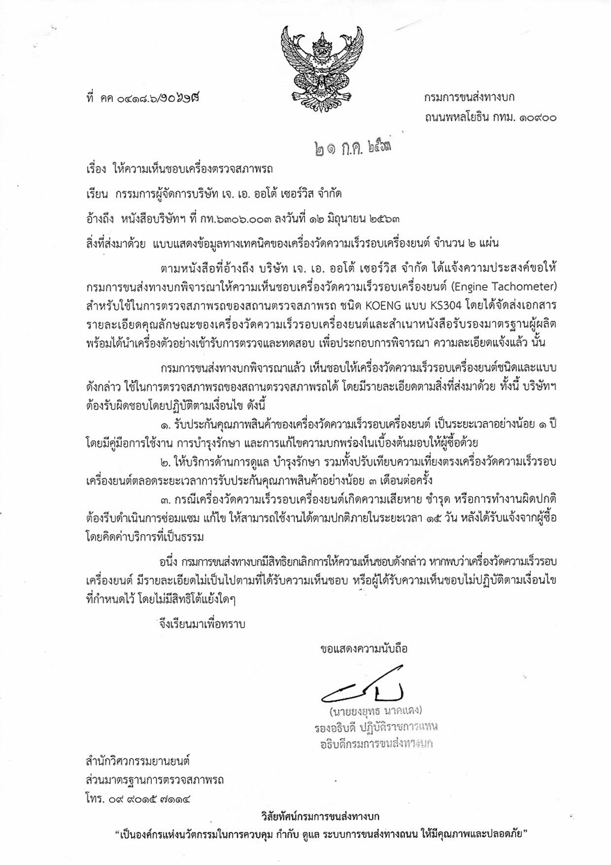 ตามหนังสือของกรมการขนส่งทางบก ที่ คค 1418.6/10618 ลงวันที่ 21 กรกฎาคม 2567 เรื่องให้ความเห็นชอบเครื่องตรวจสภาพรถ