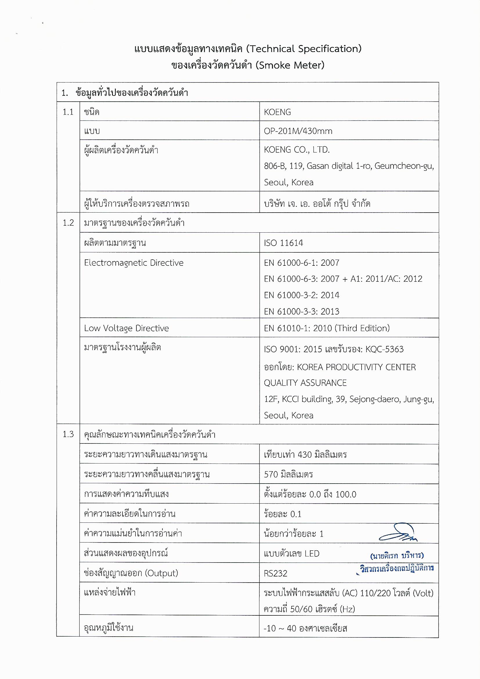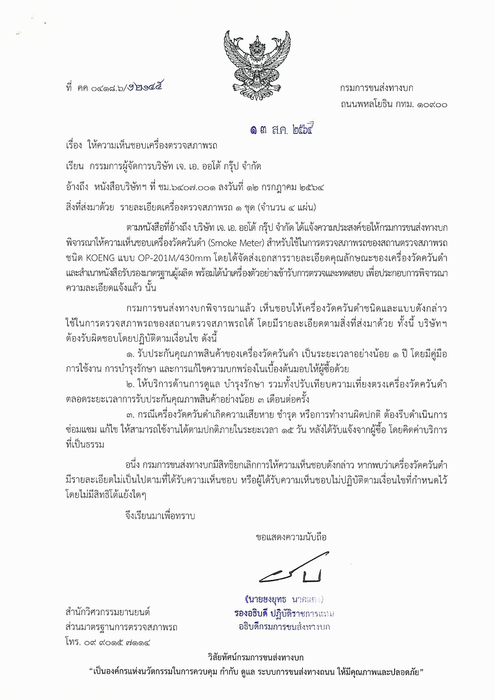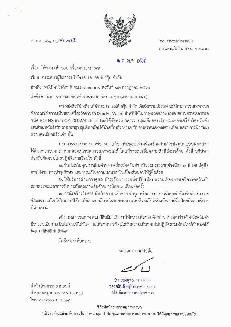 เครื่องวัดควันดำ KOENG รุ่น OP-201M/430mm ได้ผ่านการตรวจสอบและได้รับความเห็นชอบจากกรมการขนส่งทางบกเรียบร้อยแล้ว สามารถนำไปใช้ในการตรวจสภาพรถของสถานตรวจสภาพรถ (ตรอ.) ได้อย่างถูกต้องตามกฎหมาย ดูแลการจัดจำหน่ายโดย บริษัท เจ. เอ. ออโต้ กรุ๊ป จำกัด