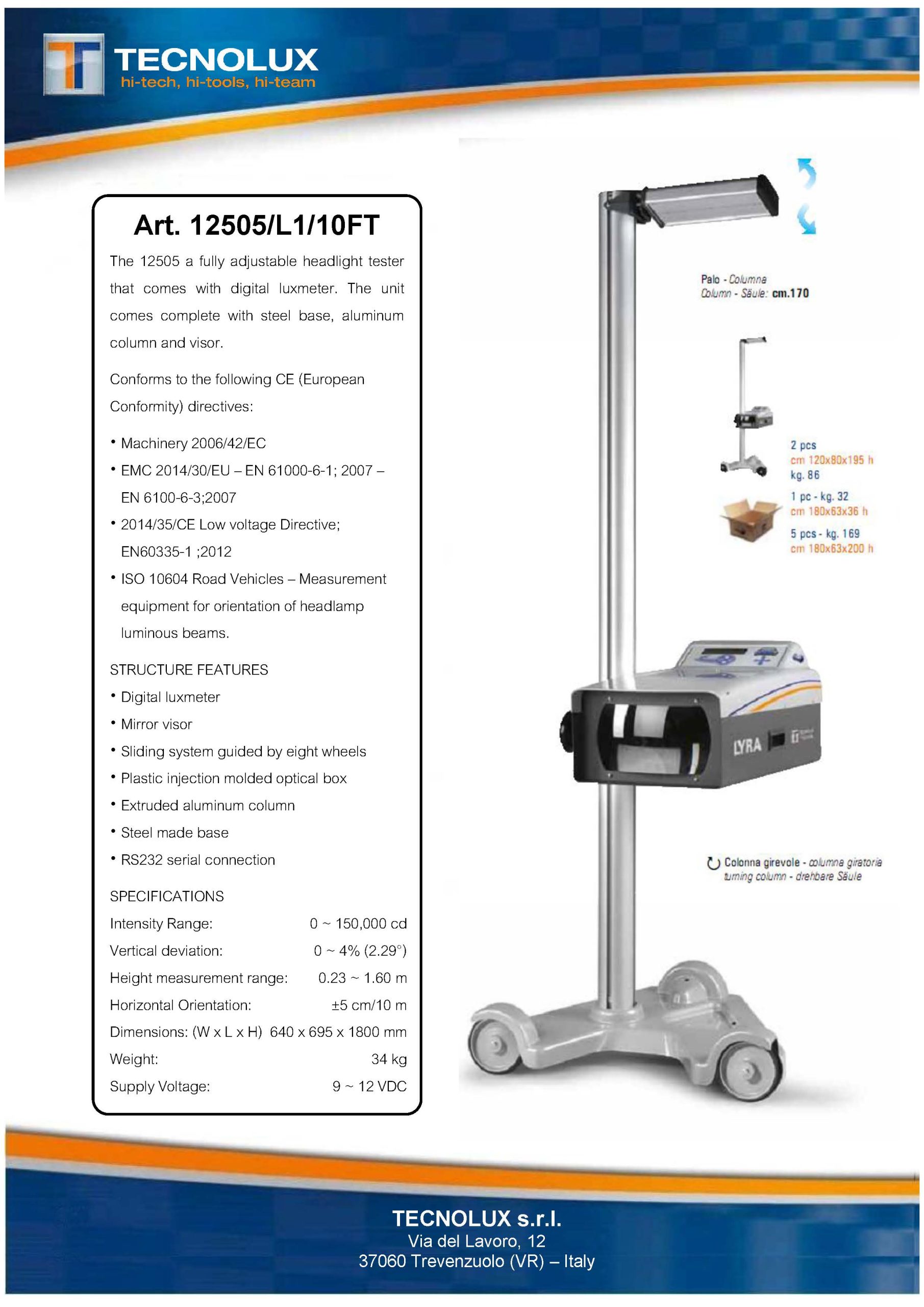 ยกระดับมาตรฐานและเพิ่มความมั่นใจในการตรวจสภาพรถด้วย เครื่องทดสอบโคมไฟหน้า TECNOLUX รุ่น Art. 12505/L1/10FT นำเข้าจากประเทศอิตาลี (ผลิตโดย TECNOLUX S.R.L.) ตัวเครื่องได้รับการออกแบบมาเพื่อวัดค่าความเข้มของการส่องสว่างและทิศทางของลำแสงไฟหน้ารถยนต์ได้อย่างรวดเร็วและแม่นยำ พร้อมโครงสร้างที่แข็งแรงทนทาน ใช้งานง่าย ตอบโจทย์การทำงานของสถานตรวจสภาพรถ (ตรอ.) อย่างสมบูรณ์แบบ
