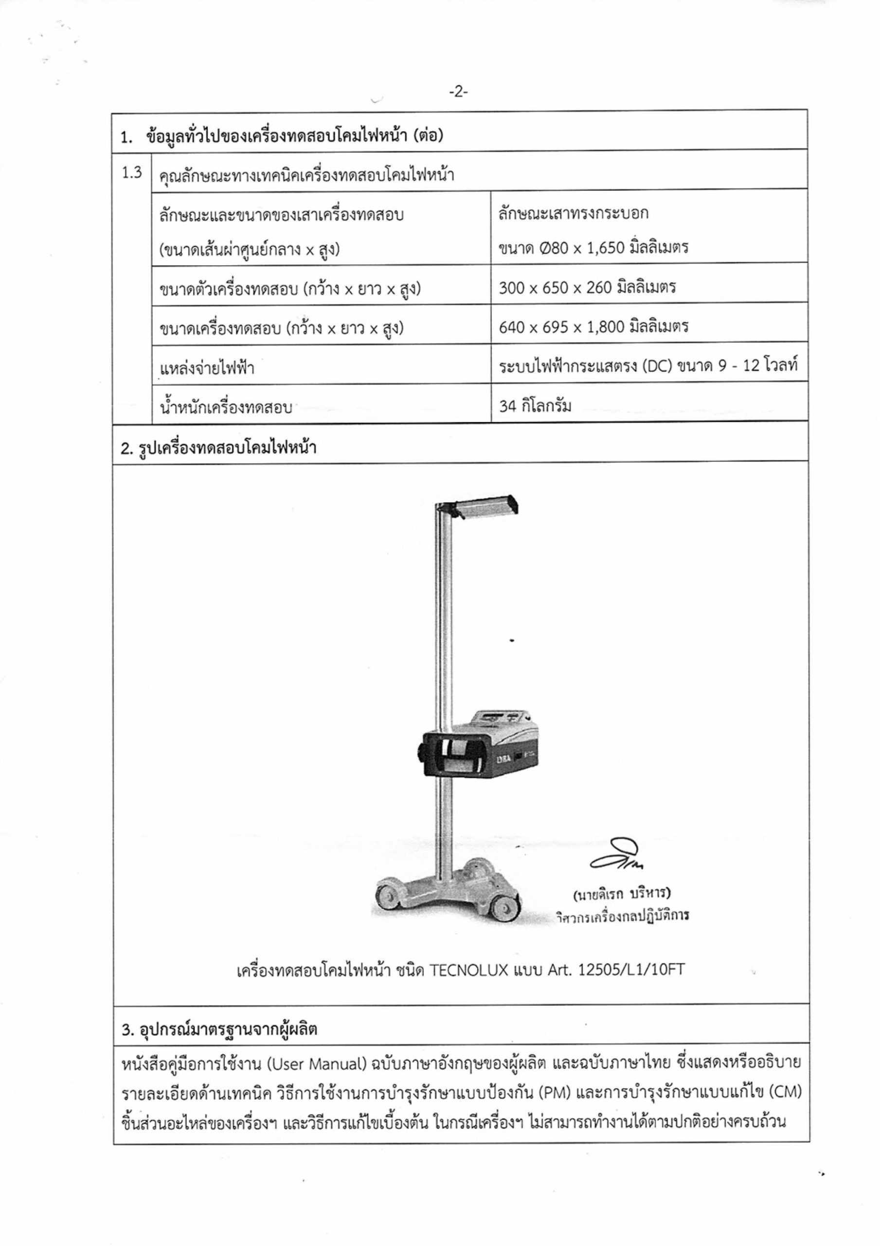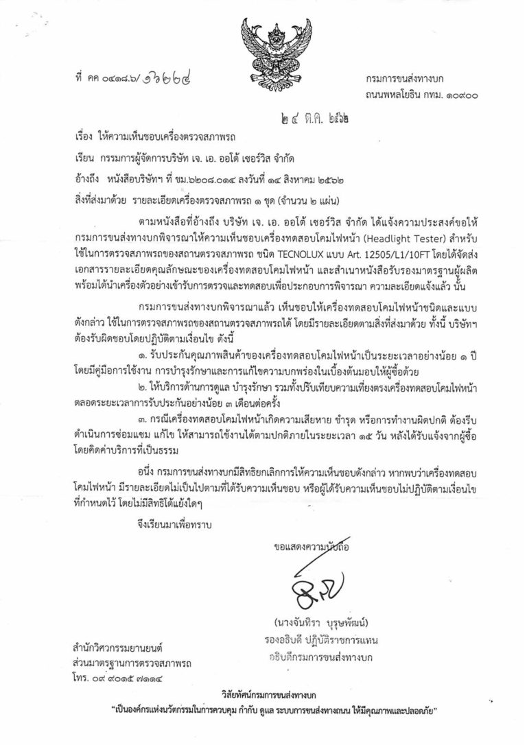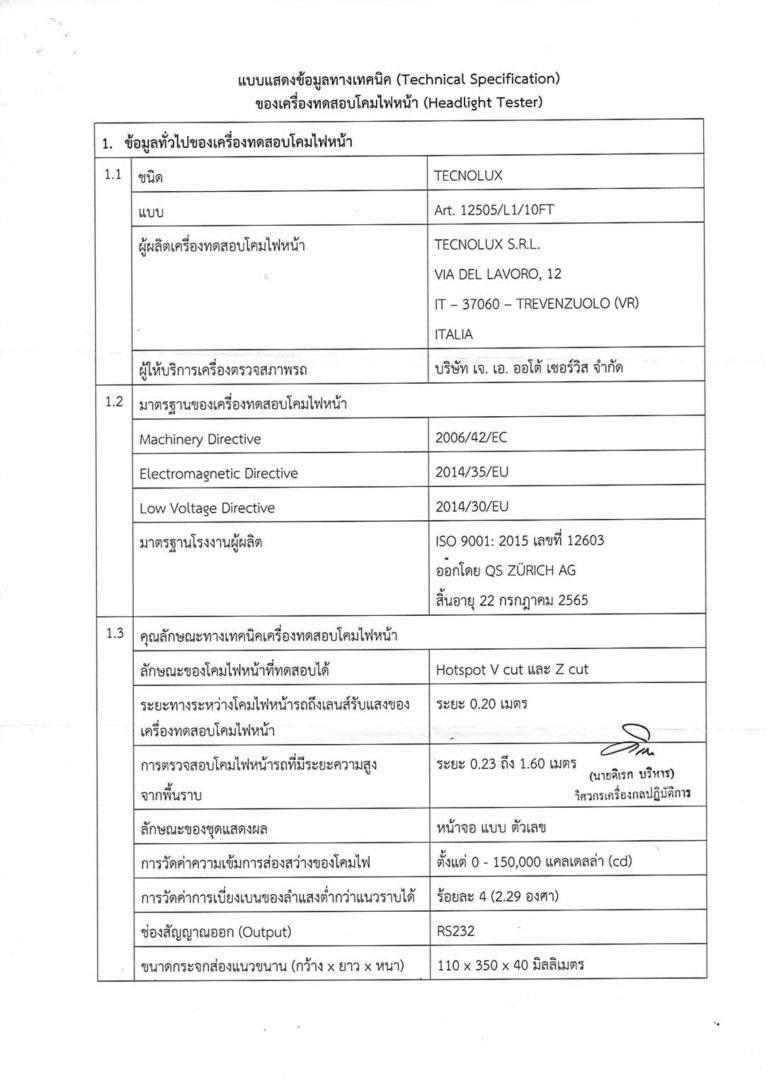 เครื่องทดสอบโคมไฟหน้า TECNOLUX รุ่น Art. 12505/L1/10FT ได้รับการตรวจสอบและให้ความเห็นชอบจากกรมการขนส่งทางบก สามารถนำไปใช้ในการตรวจสภาพรถของสถานตรวจสภาพรถเอกชน (ตรอ.) ได้อย่างถูกต้องตามกฎหมาย จัดจำหน่ายโดย บริษัท เจ. เอ. ออโต้ เซอร์วิส จำกัด