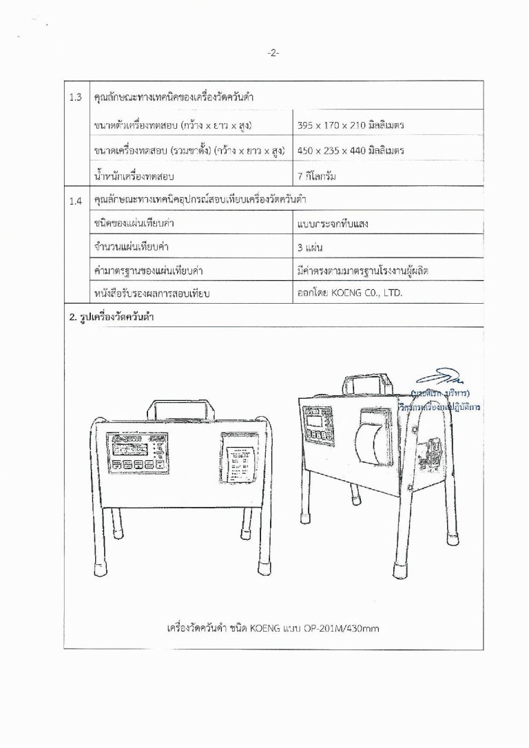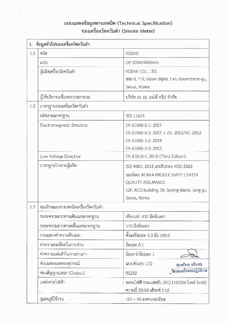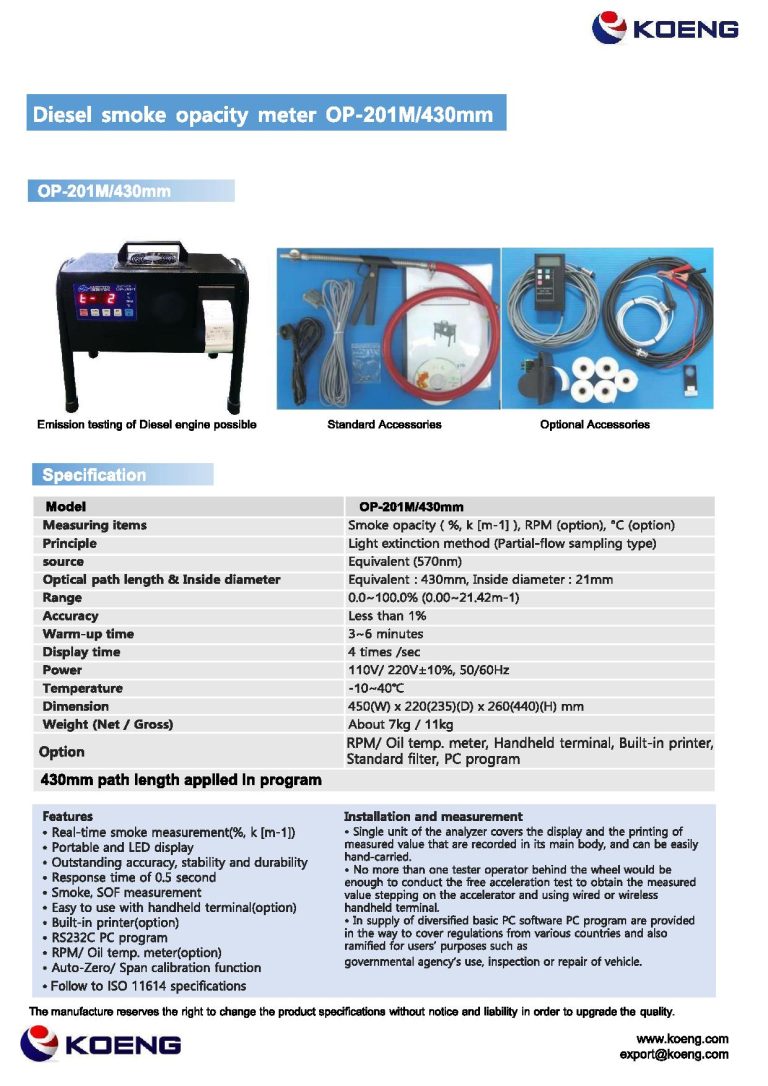 ระบบวัดความทึบแสงแบบใหม่ผ่านบางส่วน (Partial Flow Opacimeter) ระยะตรวจวัดที่ความยาวของทางเดินแสง 430 มิลลิเมตร วัดค่าความทึบแสง 0.0-100.0% แสดงผลแบบตัวเลข มีความละเอียดในการแสดงผล 0.1% ช่องสัญญาณออก (Output) RS232 ระบบไฟฟ้ากระแสสลับ (AC) 110/220 โวลท์ ความถี่ 50/60 Hz. ขนาดเครื่อง (รวมขาตั้ง) (กว้างxยาวxสูง) 450 x 235 x 440 มิลลิเมตร น้ำหนักเครื่อง 7 กก.